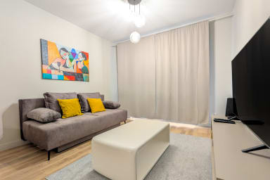 Mieszczańska Cozy Apartment offers a modern and functional space with a living room featuring a fold-out sofa and kitchenette, a bedroom with a comfortable king-size bed, a bathroom, and a cozy balcony. Guests have access to a range of amenities including free Wi-Fi, air conditioning, a Smart TV, washing machine, iron, hairdryer, dishwasher, microwave, oven, and fully equipped kitchenware.