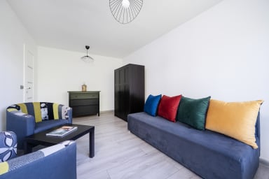 The apartment offers two bedrooms with sofa beds, a kitchen, a bathroom, and a spacious balcony where guests can relax with a morning coffee or an evening glass of wine. It is equipped with fast free Wi-Fi, cable TV, a washing machine, an iron, a hairdryer, a vacuum cleaner, a fridge with a freezer, a dishwasher, an induction hob, an oven, a kettle, a coffee maker, and kitchenware. Guests can use the public outdoor parking area without a guarantee of available spaces.
