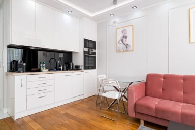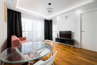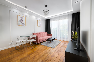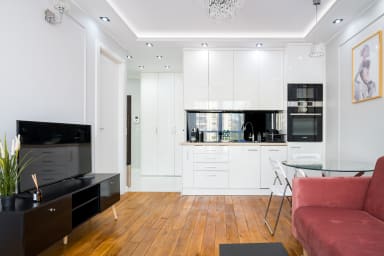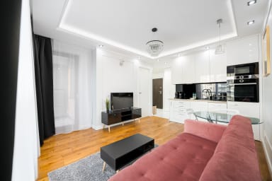 Wola Grzybowska Lavish Apartment is a stylishly designed apartment featuring a living room with a sofa bed and kitchenette, a bedroom with a comfortable double bed, a bathroom, and a spacious balcony where guests can relax and enjoy a morning coffee or an evening glass of wine. Guests have access to a range of amenities including terrestrial TV, washing machine, iron, hairdryer, dishwasher, oven, fridge with freezer, induction hob, microwave, coffee machine, kettle, and kitchenware. A parking space in the underground garage is also available for guests.