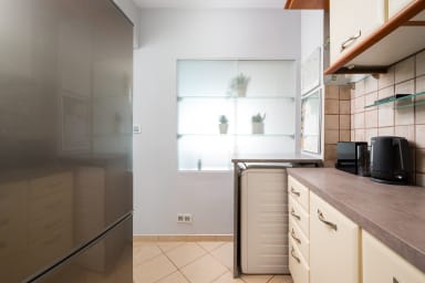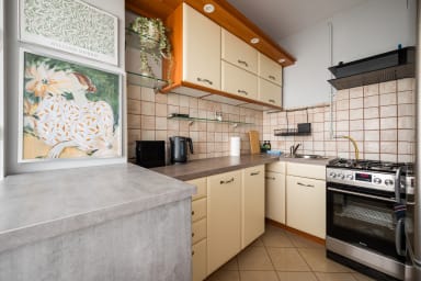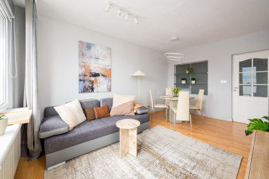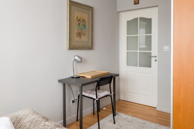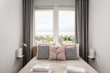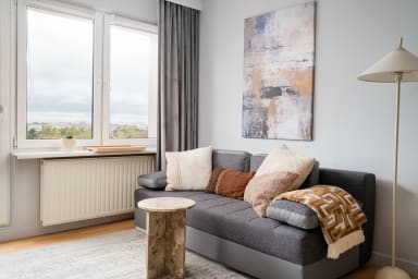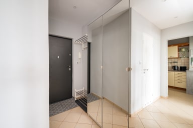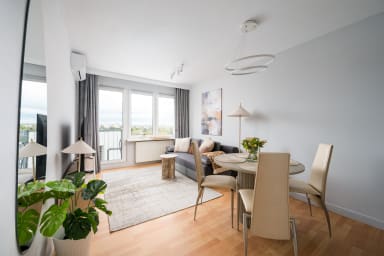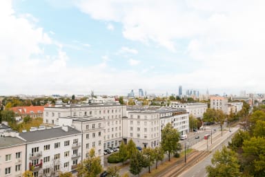 Mokotów Skyline Panorama Apartment consists of a living room with a sofa bed, a bedroom with a double bed, a kitchen, a bathroom and balcony where guests can relax and enjoy their morning coffee or an evening glass of wine.. The apartment is equipped with high-speed Wi-Fi, cable television, refrigerator with freezer, stove, oven, kettle, washing machine, a capsule coffee machine, and microwave. An iron, vacuum cleaner, and hair dryer are also available. Guests may use a parking spot (fees may apply). In addition, the apartment has air conditioning, which provides exceptional comfort, especially during hot days.