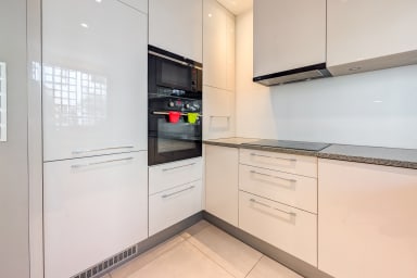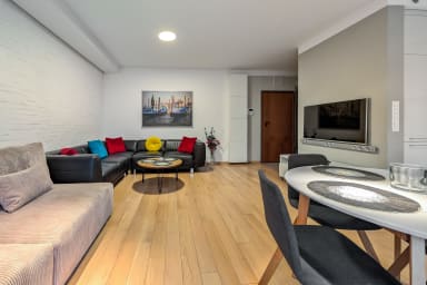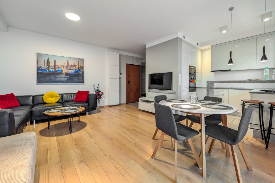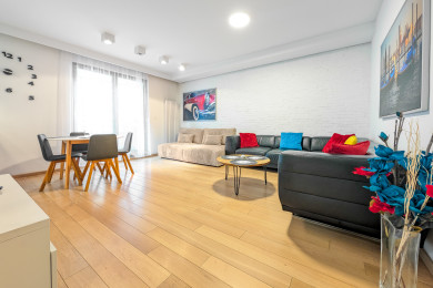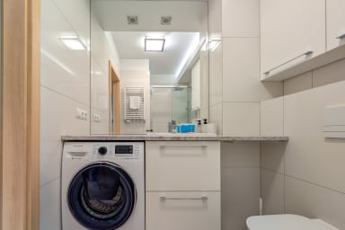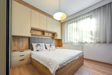 Rymarska Spacious Apartment consists of a living room with a kitchenette and sofa, a bedroom with a king size bed, a bathroom, and a balcony — the balcony is a notable asset, offering a space for outdoor relaxation. The apartment includes: Wi-Fi, television, refrigerator with freezer, stove, oven, microwave, kettle, dishwasher, and washing machine. Additionally, guests have access to an iron, vacuum cleaner, and hair dryer. A guaranteed parking space is provided.