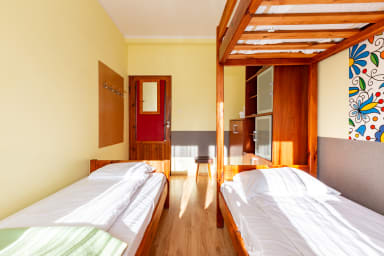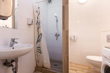 Guests have access to a shared bathroom and kitchen, both located in the common area of the property. The bathroom is equipped with a shower and a toilet. The kitchen provides all the necessary appliances for meal preparation, including an oven, microwave, kettle, fridge with freezer, and kitchen utensils. A washing machine is available on-site for an additional fee of 15 to 20 PLN per wash. This makes it a convenient option for both short and long stays.
