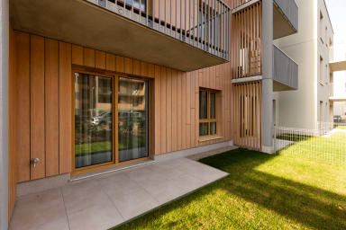 Lema Apartment with Garden consists of a living room with a sofa bed, a kitchen, a bedroom with a sofa bed, a bathroom, and a spacious private garden — the large garden is a highlight, allowing guests to relax outdoors in a peaceful setting. A parking space in the underground garage is available to guests, with a guaranteed parking spot. The apartment is equipped with Wi-Fi, cable TV, a refrigerator with a freezer, an induction hob, a dishwasher, a microwave, a kettle, and a washing machine. An iron, vacuum cleaner, and hair dryer are also provided.