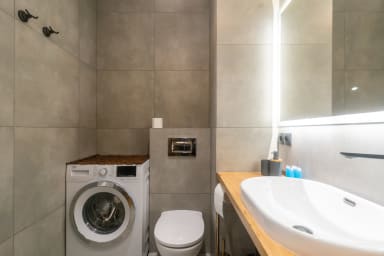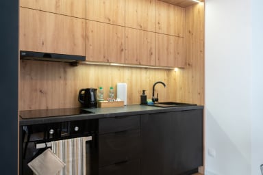 Brynów Rzepakowa Harmony Apartment consists of a spacious living room with a sofa bed and kitchenette, a bedroom with a king-size bed, and a bathroom. The apartment is equipped with high-speed Wi-Fi, cable television, a refrigerator with freezer, induction cooktop, dishwasher, kettle, washing machine, iron, vacuum cleaner, and hair dryer. Guests also have access to a private parking space with a guaranteed spot.