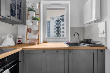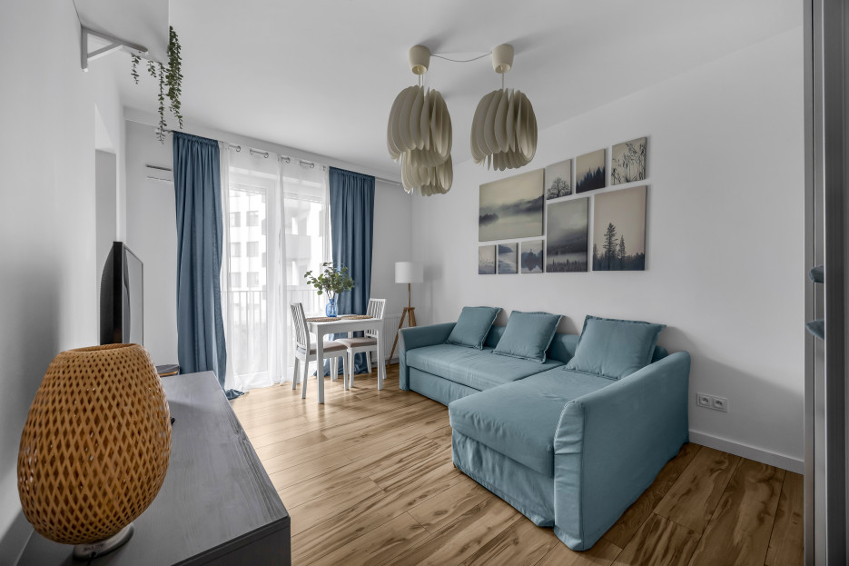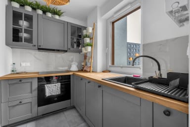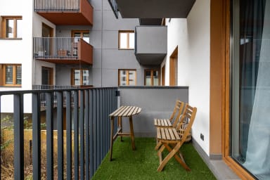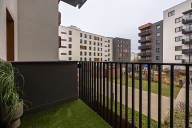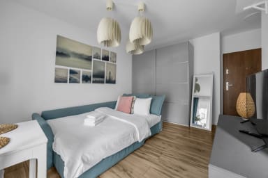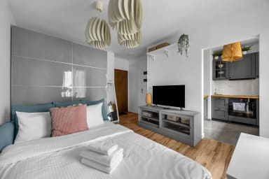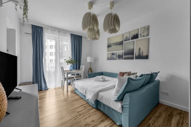 Podskarbińska Modern Space Studio features a cozy living room with a sofa bed and kitchenette, a bathroom, and a balcony where guests can relax and enjoy their morning coffee or an evening glass of wine. Guests have access to a range of practical amenities, including a washing machine, iron, hairdryer, refrigerator with freezer, dishwasher, induction cooktop, oven, capsule coffee machine, and kitchen accessories.