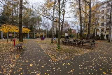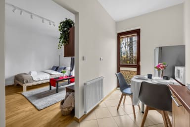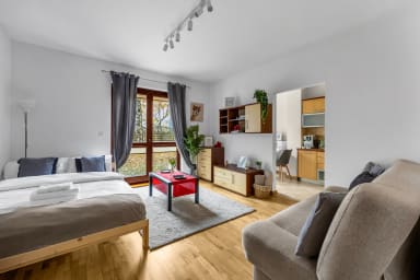 Olbrachta Garden Studio is a unique apartment located at 29a Olbrachta Street in the Wola district of Warsaw – a peaceful, green neighborhood that combines the comfort of city living with easy access to nature and recreation. Its location makes it an excellent choice for both business travelers and tourists eager to explore the capital. In the immediate vicinity, you will find grocery stores, bakeries, cafés, and restaurants, allowing you to take care of everyday needs with ease. Just a short walk away lies the Moczydło Park and Forest Complex — an extensive green area with a lake, walking and cycling paths, and relaxation zones, ideal for an active morning or a calm afternoon outdoors. About two kilometers from the apartment is Park Górczewska, another inviting spot where you can unwind among the trees and enjoy a break from the urban bustle. The apartment benefits from excellent public transport connections, ensuring quick and easy access to various parts of the city. Nearby are bus and tram stops, while the Księcia Janusza metro station is within walking distance. The Warszawa Główna Towarowa and Warszawa Zachodnia railway stations are conveniently located about five kilometers away, offering smooth connections both within Warsaw and beyond. Reaching the city center – including the Old Town or the Śródmieście district – takes around 30 minutes by tram or bus, making it easy to explore the capital’s most iconic landmarks and attractions.
