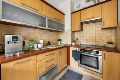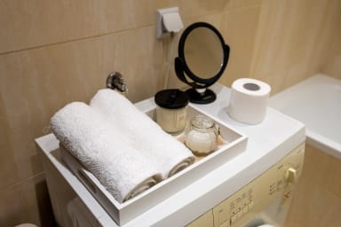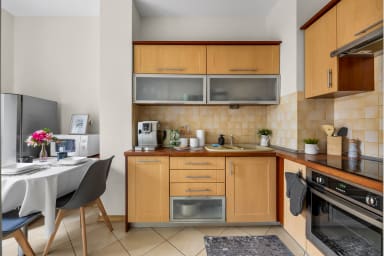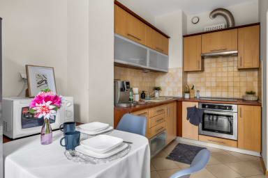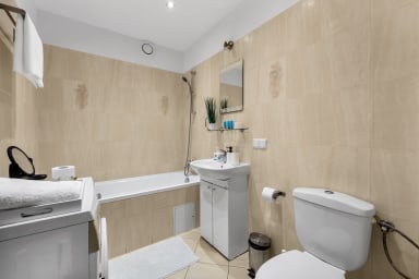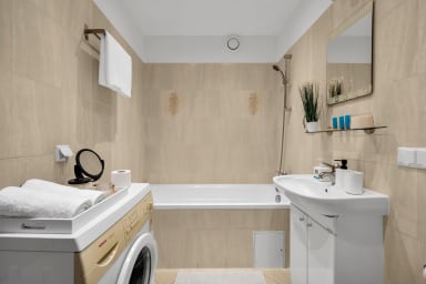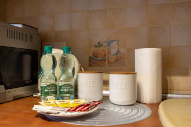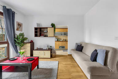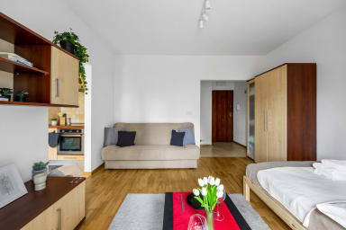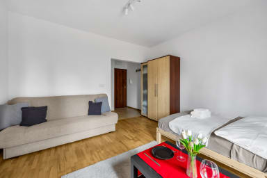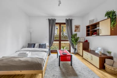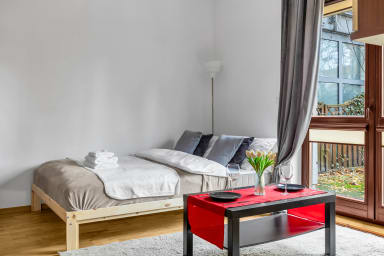Olbrachta Garden Studio consists of a living room with a fold-out sofa and a double bed, a fully equipped kitchen, a bathroom, and a spacious garden — a unique feature that allows guests to relax outdoors in comfort. The apartment offers a range of amenities, including high-speed Wi-Fi, a dishwasher, a refrigerator with freezer, an induction hob, microwave, an oven, a kettle, and a drip coffee maker. For guests’ convenience, there is also an iron, a vacuum cleaner, and a hairdryer available. At the beginning of your stay, a starter set of basic hygiene products is provided — toilet paper, soap, shampoo, and shower gel. Please note that these items are limited and intended for the first days of your stay. To ensure full comfort, we recommend purchasing additional products according to your personal needs.