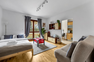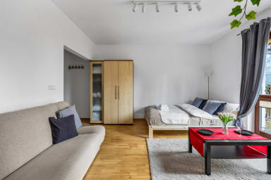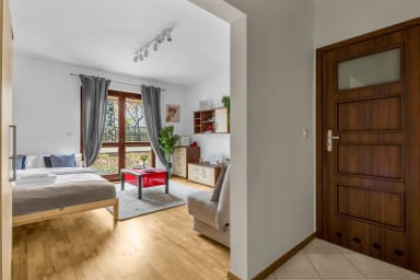 Olbrachta Garden Studio is a unique apartment located at 29a Olbrachta Street in the Wola district of Warsaw – a peaceful, green neighborhood that combines the comfort of city living with easy access to nature and recreation.
