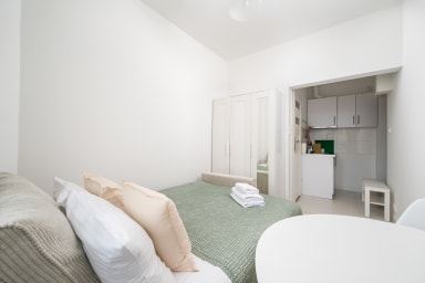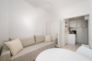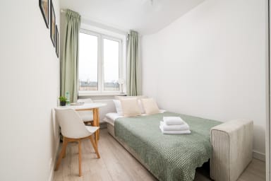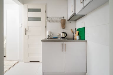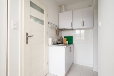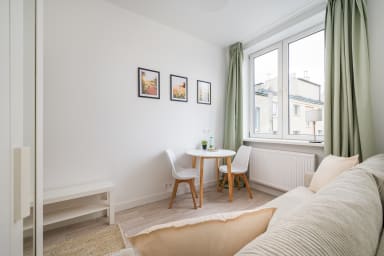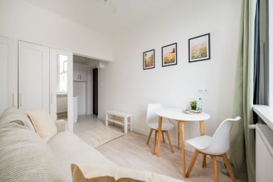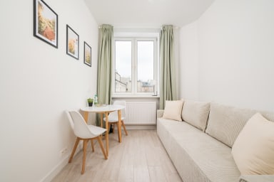 Tamka Powiśle Green Studio is a cozy and warmly decorated apartment featuring a room with a sofa bed and a kitchenette, as well as a bathroom. Guests have access to various practical amenities, including free WiFi, a washing machine, an iron, a hairdryer, a refrigerator with a freezer, an induction hob, a kettle, and kitchen utensils. There is a parking lot next to the apartment, but there is no guarantee of availability, and fees may apply.