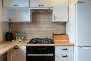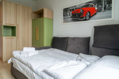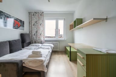 Bogucice Hoppego Apartment consists of a living room with a sofa bed, a bedroom with a double bed, a second bedroom with a sofa bed, a kitchen, a bathroom, a toilet, and a balcony. The apartment is equipped with Wi-Fi, a refrigerator with freezer, dishwasher, gas stove, oven, kettle, and washing machine. Additional amenities include an iron, vacuum cleaner, and hair dryer. A parking space is available for guests, although availability cannot be guaranteed.