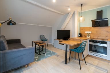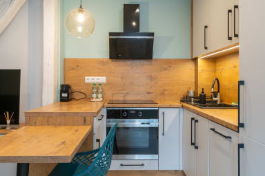 Fabryczna City Apartment consists of a living room with a sofa bed, a kitchenette, a bedroom with a double bed, and a bathroom. The apartment is equipped with a full range of amenities, including Wi-Fi, a television, a refrigerator with a freezer, an induction cooktop, an oven, a toaster, a capsule coffee machine, a kettle, and a washing machine. Additionally, an iron, a vacuum cleaner, and a hair dryer are available for guests. Parking is available on site, although a free space cannot be guaranteed.