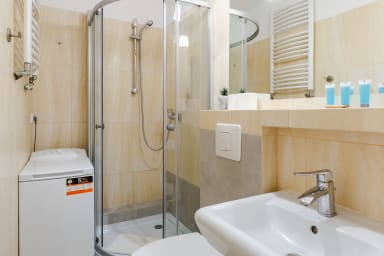 Przymorze Comfort Apartment features a living room with a sofa bed, a bedroom with two single beds, a kitchen, and a bathroom. Guests have access to a range of practical amenities including free WiFi, cable TV, a washing machine, an iron, a fridge with freezer, a dishwasher, an oven, a microwave, a Tchibo coffee machine, a kettle, and kitchen accessories. Guests may also use the public outdoor parking area without guaranteed parking spaces.