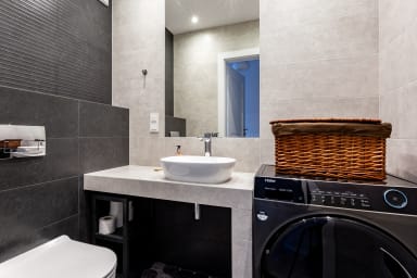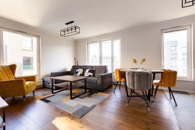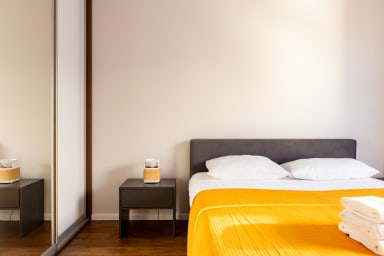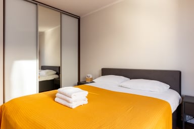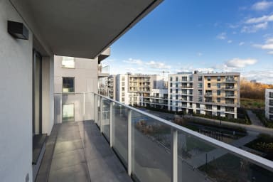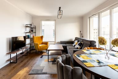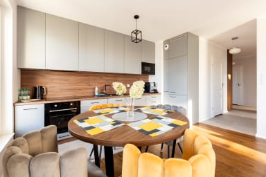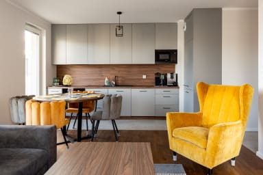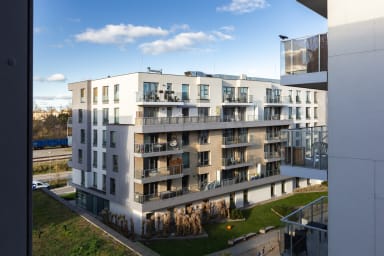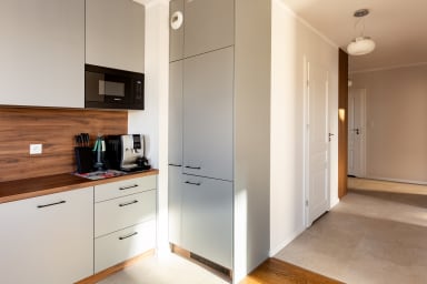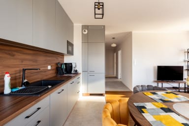 Starowiejska 91 Superior Apartment features a stylish living room with a sofa bed and kitchenette, a bedroom with a comfortable double bed, a bedroom with two single beds, a bathroom, and a spacious balcony where guests can relax with a morning coffee or an evening glass of wine. Guests have access to a range of practical amenities, including free Wi-Fi, cable TV, a washer-dryer, an iron, a hairdryer, a fridge with freezer, a dishwasher, an oven, an induction hob, a microwave, a toaster, a coffee machine, a kettle, and kitchen accessories. A parking space in the underground garage is also available.