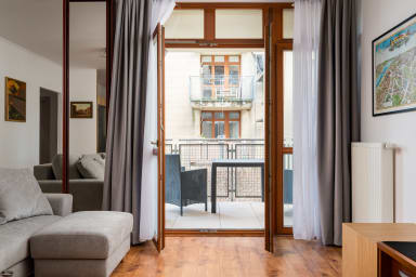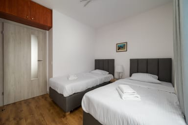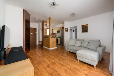 Bemowo 2-Bedroom Apartment is a stylishly furnished space featuring a living room with a sofa bed and a kitchenette, a bedroom with a comfortable double bed, a bedroom with two single beds, a bathroom, a separate toilet, and a spacious balcony where guests can relax and enjoy a morning coffee or an evening glass of wine. Guests have access to a range of practical amenities, including free Wi-Fi, an iron, a washing machine, a hairdryer, a dishwasher, a fridge, an oven, an induction hob, a kettle, and kitchen utensils. A parking space in the underground garage is also available to guests.