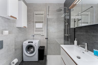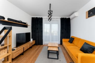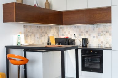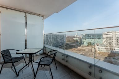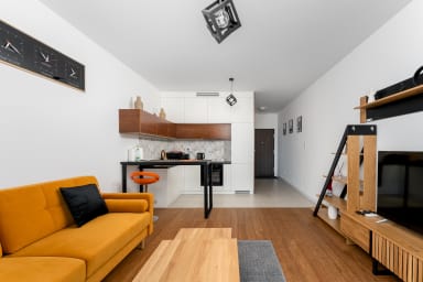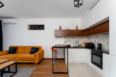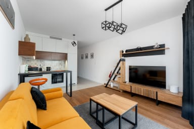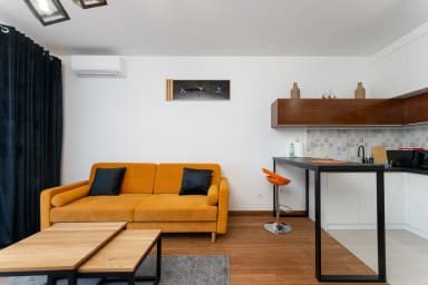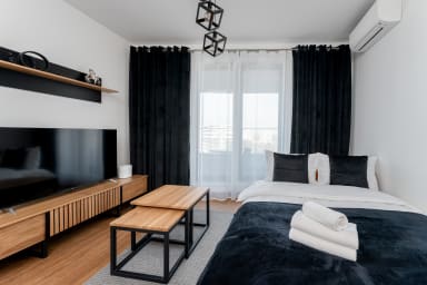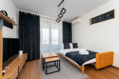 Vistula Terraces 2.0 Modern Space Studio is a stylishly furnished apartment featuring a living room with a sofa bed and kitchenette, a bathroom, and a balcony, where guests can relax and enjoy their morning coffee or evening glass of wine. Guests have access to a range of practical amenities, including free Wi-Fi, a TV, air conditioning, a washing machine, an iron, a hairdryer, a dishwasher, an oven, a microwave, a refrigerator with a freezer, and kitchen accessories.