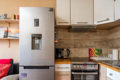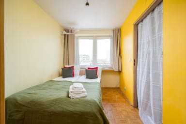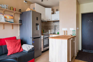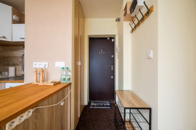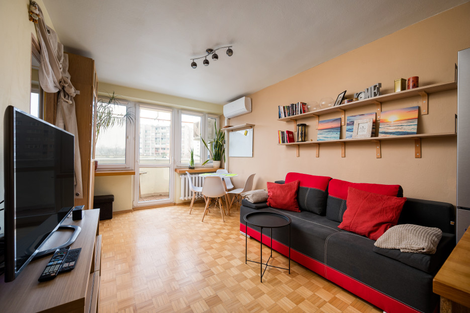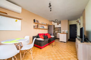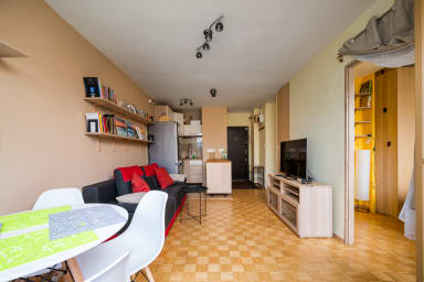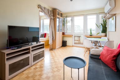 Solec Powiśle Homely Apartment features a cozy living room with a sofa bed and a kitchenette, a bedroom with a comfortable double bed, a bathroom, and a balcony where guests can relax and enjoy a morning coffee or an evening glass of wine. Guests have access to a range of practical amenities, including free Wi-Fi, cable TV, a washing machine, iron, hairdryer, fridge with freezer, oven, induction cooktop, toaster, coffee maker, kettle, and kitchenware. The apartment is also equipped with air conditioning, providing exceptional comfort, especially during hot days. Guests may use public outdoor parking near the building without a guaranteed parking space, with a possible additional fee.