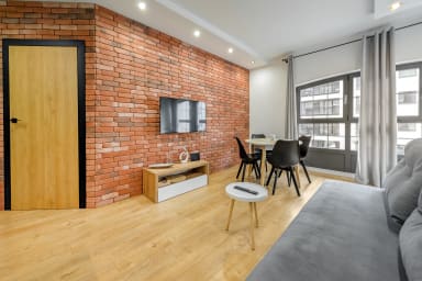 Mieszczańska Riverfront Apartment is a stylish and well-designed space featuring a living room with a sofa bed and kitchenette, a bedroom with a comfortable double bed, and a bathroom. Guests have access to a wide range of amenities, including free Wi-Fi, a Smart TV, washing machine, iron, hair dryer, dishwasher, oven, capsule coffee machine, and kitchen accessories. An underground parking space is also available for guests.