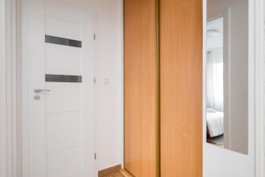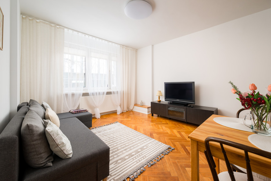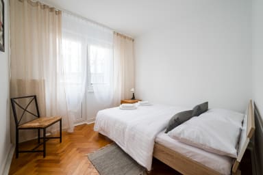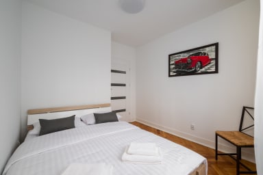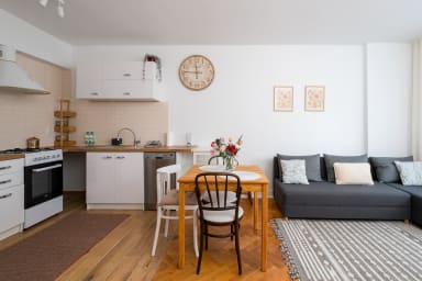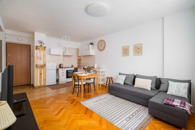 Twarda Downtown Apartment is a cozy and well-appointed space featuring a living room with a sofa bed and kitchenette, a bedroom with a comfortable double bed, a bathroom, and a spacious balcony where guests can relax with a morning coffee or an evening glass of wine. Guests have access to a range of amenities, including free WiFi, cable TV, a washing machine, iron, hair dryer, fridge with freezer, dishwasher, oven, electric kettle, and kitchen utensils. Guests may use public outdoor parking near the building without a guaranteed space and with a possible additional fee.