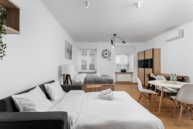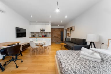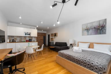 Starowiślna 14 Downtown Studio #9A is a comfortable apartment featuring a living area with a comfortable double bed and a sofa bed, a kitchenette, and a bathroom. The apartment offers a range of amenities, including free WiFi, a TV, a washing machine, a hairdryer, an iron, a fridge with a freezer, an electric kettle, an induction cooktop, a dishwasher, a microwave, a coffee machine, and essential kitchen utensils.