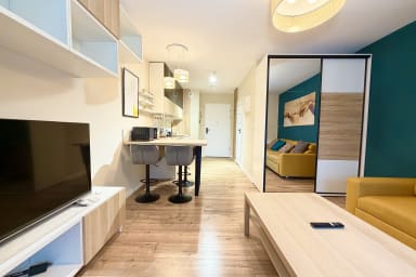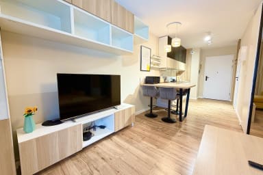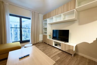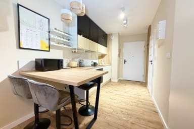 Traugutta Stylish Studio FREE Parking is a cozy and modern apartment featuring a living room with a sofa bed, a kitchenette, a bathroom, and a balcony. The balcony is the perfect place to relax, enjoy your morning coffee, or enjoy an evening glass of wine.