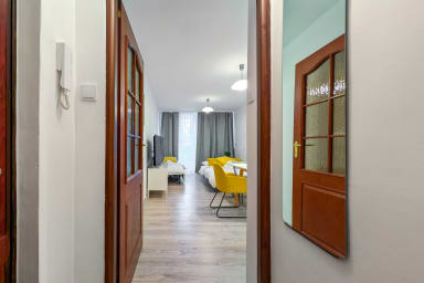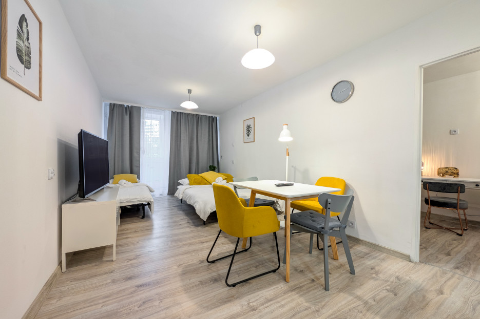 Powstańców Śląskich Homely Apartment is a stylish apartment located at Powstańców Śląskich Street 107 in Wrocław, in a quiet and green part of the city that combines easy access to urban infrastructure, universities, and services with proximity to recreational areas.