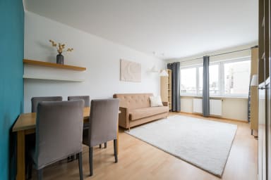 Metro Ursynów Homely Apartment is a cozy apartment featuring a living room with a sofa bed, a bedroom with a comfortable double bed, a kitchen, a bathroom, and a balcony where guests can relax with a morning coffee or an evening glass of wine. Guests have access to a range of amenities, including free WiFi, a TV, a washing machine, an iron, a hairdryer, a fridge with a freezer, a dishwasher, an oven, a toaster, a kettle, and kitchen utensils. Guests also have access to a parking space in the underground garage.