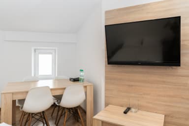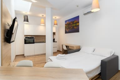Bosacka Downtown Apartment features a living room with a sofa bed and kitchenette, a bedroom with a comfortable double bed, and a bathroom. It offers a range of high-standard amenities, including free Wi-Fi, cable TV, hairdryer, iron, oven, electric hob, coffee machine, kettle, fridge with freezer, and kitchenware. The apartment is also equipped with air conditioning, ensuring extra comfort, especially during hot summer days.