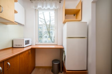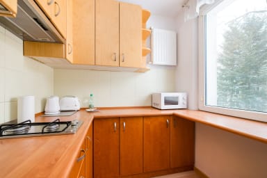 Bielany Urban Living Apartment features a living room with a sofa bed, a kitchen, a bathroom, and a balcony where guests can relax and enjoy a morning coffee or an evening glass of wine. Guests have access to many amenities, including free Wi-Fi, a washing machine, iron, hairdryer, fridge with freezer, microwave, toaster, kettle, and kitchen utensils. Guests can also use the shared outdoor parking with possible additional fees.