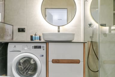 Global Park 21st View Studio features a stylishly furnished living area with a sofa bed and a double bed, a kitchenette, and a bathroom. From the apartment windows, guests can enjoy a stunning panoramic view of the city. Guests have access to a variety of amenities, including free Wi-Fi, a TV, an iron, a hair dryer, a washing machine, a fridge with a freezer, an induction cooktop, an oven, a microwave, a toaster, a kettle, and kitchen utensils. Additionally, the apartment is equipped with air conditioning, ensuring exceptional comfort, especially during hot days. Guests also have access to a private parking space. On the third floor, there is a shared patio, perfect for relaxation or meeting outdoors.
