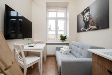 Łódź Downtown Studio 7C with Mezzanine is a cozy apartment featuring a living room with a sofa bed and a kitchenette, a mezzanine with a comfortable mattress, and a bathroom. Guests have access to a range of practical amenities, including free WiFi, a TV, a washing machine, a tumble dryer, an iron, a hairdryer, a fridge with a freezer, an induction cooktop, a toaster, a coffee machine, a kettle, and kitchen accessories.