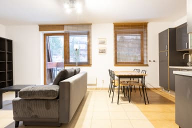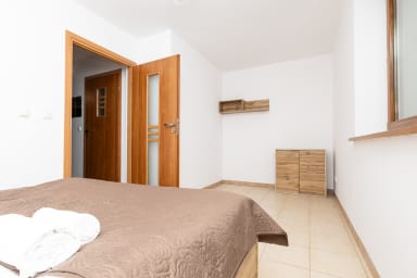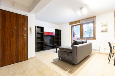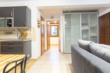 Krzeptowskiego Residence Apartment is a very cozy and tastefully furnished space featuring a living room with a sofa bed, a bedroom with a comfortable king-size bed, a kitchenette, a bathroom, and a balcony where guests can relax with a morning coffee or an evening glass of wine. Guests have access to a range of practical amenities, including free Wi-Fi, cable TV, an iron, a hairdryer, a refrigerator with a freezer, a microwave, a coffee machine, and kitchen accessories. The apartment includes a private parking space for guests, located in a lockable garage next to the building (above-ground garage).