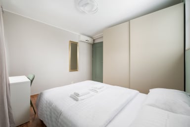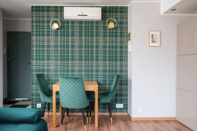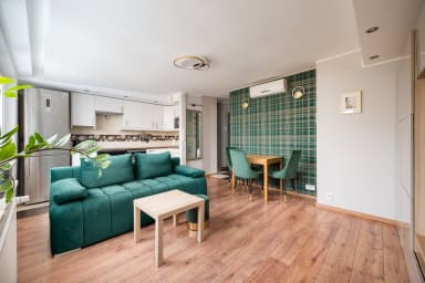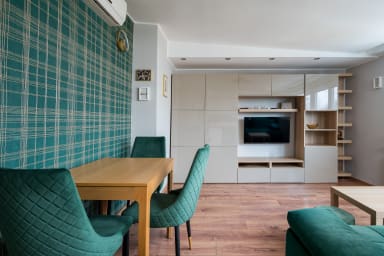 Ogród Saski Harmony Apartment is a practically furnished apartment featuring a living room with a sofa bed and kitchenette, a bedroom with a double bed, and a bathroom. Guests can enjoy a wide range of amenities, including a washing machine, iron, hair dryer, kettle, fridge with freezer, oven, dishwasher, microwave, and kitchenware. The apartment is also equipped with air conditioning, providing exceptional comfort, especially on hot days. Guests may use public parking nearby; however, availability is not guaranteed and parking fees may apply.