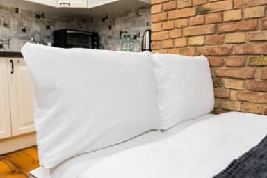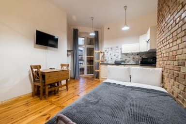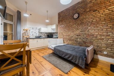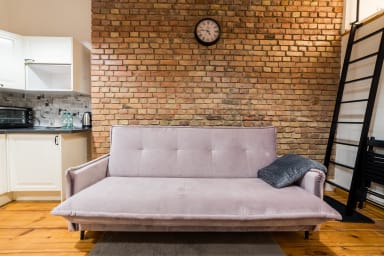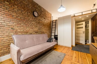 Garbary Studio with Mezzanine consists of a living room with a sofa and kitchenette, a sleeping mattress on the mezzanine, a bathroom, and a balcony where guests can relax and enjoy a morning coffee or a glass of wine in the evening. The apartment is equipped with Wi-Fi, tv, a fridge with a freezer, a dishwasher, an electric hob, an oven, a kettle, a washing machine, and kitchenware. An iron, a vacuum cleaner, and a hair dryer are also available.