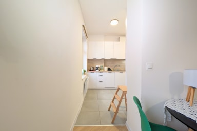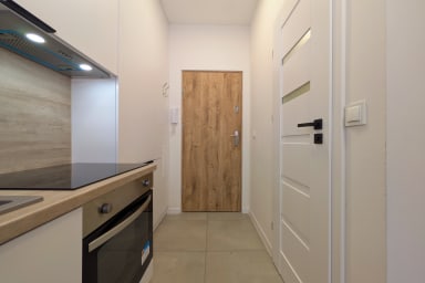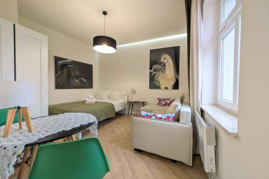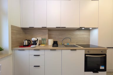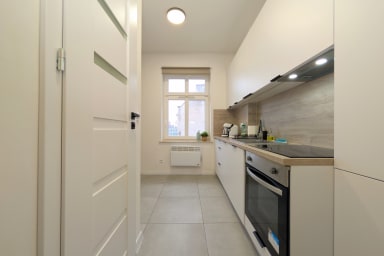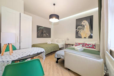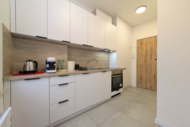 Rozbrat Green Point Apartment is a stylishly designed space featuring a living area with a sofa bed and a comfortable double bed, a kitchen, and a bathroom. Guests can enjoy free Wi-Fi, a TV, a washing machine, an iron, a hair dryer, a dishwasher, an oven, an induction hob, a capsule coffee machine, and kitchenware.