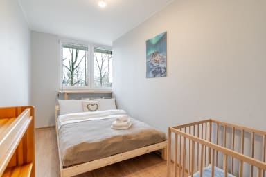 Osiedle Tysiąclecia Piastów Apartment is a cozy, well-furnished apartment featuring a living room with a sofa bed, a bedroom with a comfortable double bed, a second bedroom with a king-size bed, a kitchen, a balcony, and a bathroom. Guests have access to various amenities, including free Wi-Fi, TV, washing machine, iron, hair dryer, dishwasher, oven, fridge with freezer, microwave, toaster, kettle, and kitchenware. The apartment is also equipped with a baby cot and a high chair. Parking is also available, but spaces are not guaranteed.