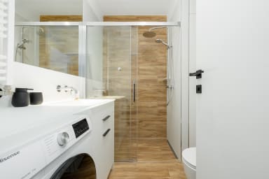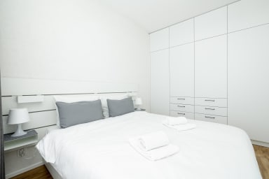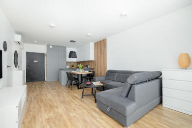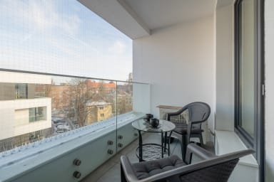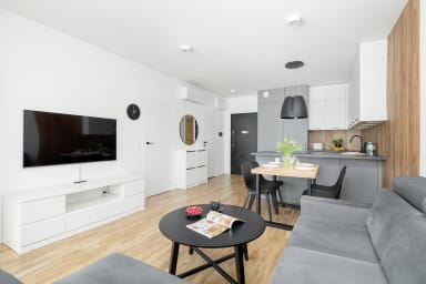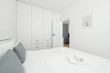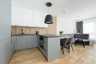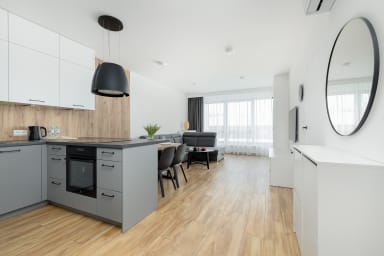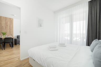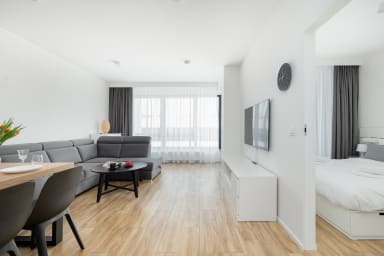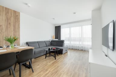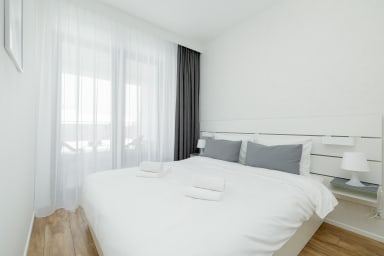 Szczecin Elegance Apartment features a living room with a sofa bed and a kitchenette, a bedroom with a comfortable double bed, a bathroom, and a spacious balcony where guests can relax and enjoy a morning coffee or an evening glass of wine. The apartment offers a range of high-end amenities, including free Wi-Fi, a TV, a washing machine, an iron, a hair dryer, an oven, a refrigerator, a dishwasher, a toaster, a kettle, and kitchenware. The apartment is equipped with air conditioning to ensure a comfortable stay, especially on warmer days. Guests also have access to a private parking space in the underground garage.