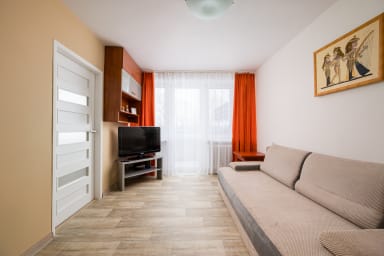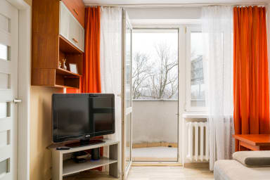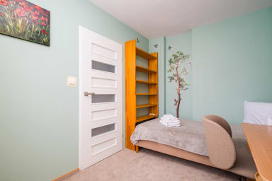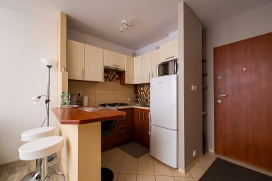 Solec Powiśle Harmony Apartment features a cozy living room with a sofa bed and a kitchenette, a bedroom with a comfortable single bed and a desk suitable for studying or remote work, a bathroom, and a balcony where guests can relax and enjoy a morning coffee or an evening glass of wine. Guests have access to a range of practical amenities, including free Wi-Fi, a TV, a washing machine, a vacuum cleaner, a fan, an iron, a hair dryer, a fridge with a freezer, a gas stove, a microwave, and kitchenware.