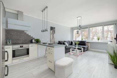 Szczecin 9 Maja Bright Studio is a cozy apartment featuring a living area with a sofa bed, a kitchenette, and a bathroom. It offers a wide range of high-quality amenities, including free WiFi, a TV, a washing machine, an iron, a hairdryer, an oven, a fridge, a dishwasher, a stove, and kitchen accessories.