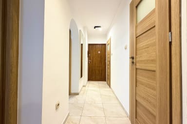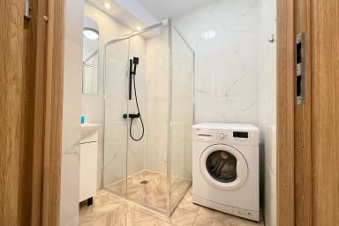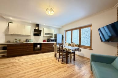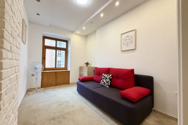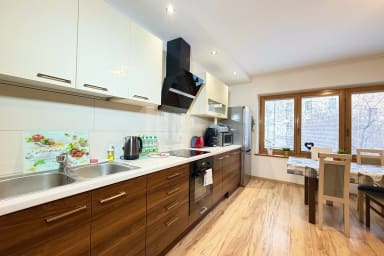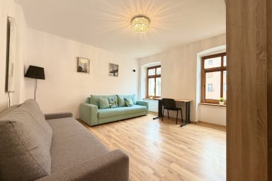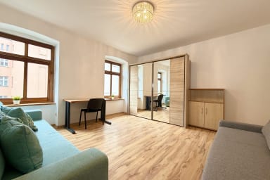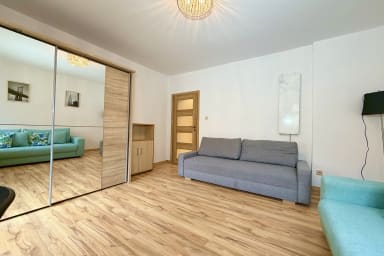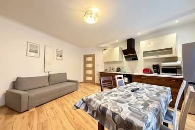 Rynek Wrocław Apartment for 8 People is a spacious apartment featuring a living room with two sofa beds and a kitchenette, two separate bedrooms, a bathroom, and a separate toilet. Guests have access to a full range of amenities ensuring comfort and independence during their stay, including fast, free Wi-Fi, cable TV, a washing machine, a fan, an iron, a hairdryer, an induction cooktop, an oven, a microwave, a toaster, a coffee maker, an electric kettle, and full kitchen equipment.