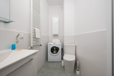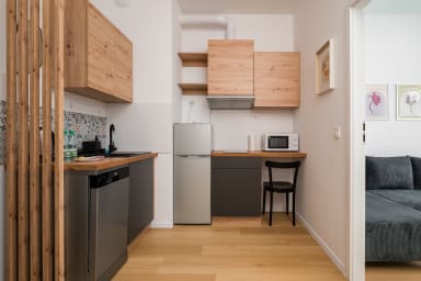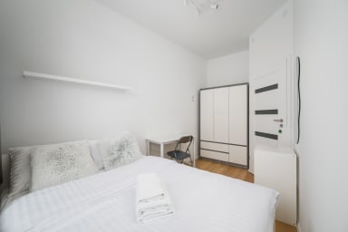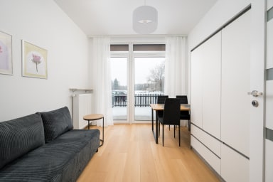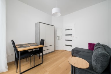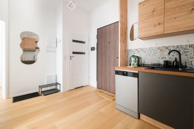 Aleja Krakowska Harmony Apartment features a practically furnished living room with a sofa bed, a kitchen, a bedroom with a comfortable double bed, a bathroom, and a spacious terrace where guests can relax and enjoy a morning coffee or an evening glass of wine. The apartment offers a wide range of high-quality amenities, including free WiFi, a washing machine, an iron, a hairdryer, a fridge with freezer, a dishwasher, an oven, a microwave, a toaster and kitchen accessories. Guests also have access to a parking space in the underground garage.