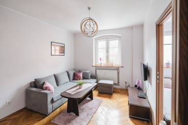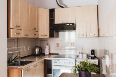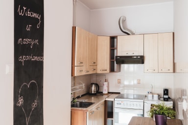 Toruń Old Town Copernicus Apartment #2 is a cozy apartment featuring a living room with a sofa bed and kitchenette, a bedroom with a comfortable double bed, and a bathroom. Guests have access to a range of practical amenities, including free Wi-Fi, cable TV, a washing machine, a hairdryer, an iron, a fridge, an electric stove, an oven, a Nespresso coffee machine, a kettle, and kitchen utensils. Guests may use the shared outdoor parking outside the building, although parking spaces are not guaranteed.