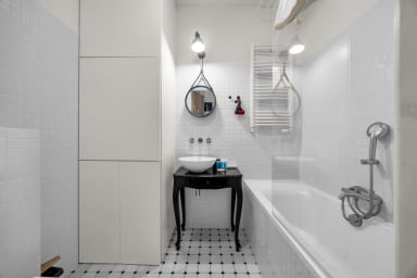Royal Baths Superior Apartment is a spacious apartment in the heart of Warsaw, located next to the Royal Łazienki Park and Agrykola Park in a prestigious neighborhood surrounded by embassies. The apartment is situated in a unique location in the city center, immersed in the greenery of Warsaw’s most beautiful parks. It is directly adjacent to the Royal Łazienki Park and Agrykola Park, neighboring numerous embassies (including those of the United Kingdom, Spain, the Netherlands, Japan, and others). This exceptional setting combines a central location, perfectly connected with the rest of Warsaw, with a მშვიდ and intimate retreat among green spaces: parks, embassies, walking paths, cycling routes, historic streets, and charming restaurants.