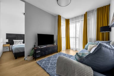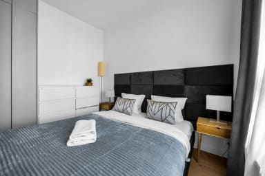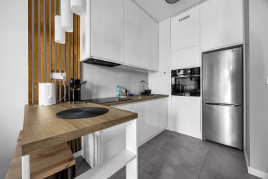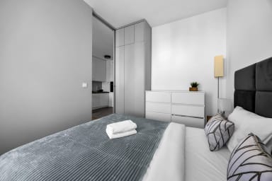 Białej Floty Superior Apartment is stylishly furnished and features a living room with a sofa bed and a kitchenette, a separate sleeping area with a comfortable double bed, a bathroom, and a spacious balcony where guests can relax while enjoying a morning coffee or an evening glass of wine. Guests have access to a wide range of practical amenities, including free WiFi, cable TV, a washing machine, iron, hairdryer, fridge with freezer, dishwasher, oven, induction cooktop, microwave, kettle, and kitchen accessories. The apartment is also equipped with air conditioning, ensuring exceptional comfort, especially during hot days. Additionally, guests have access to a private parking space in the underground garage.