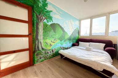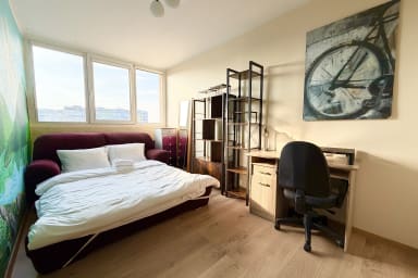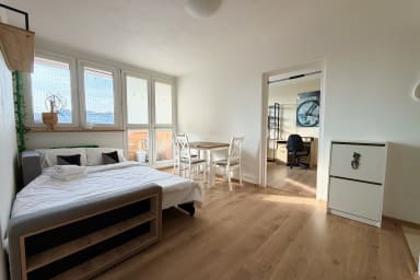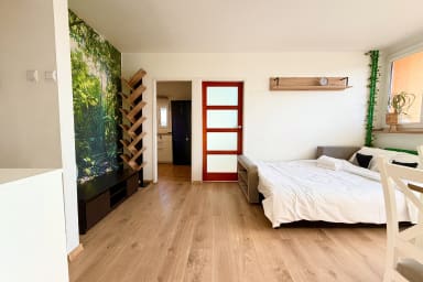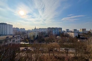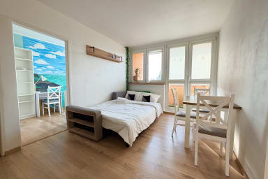Zaporoska Skyline View Apartment is a stylish apartment located at 40 Zaporoska Street in Wrocław, in a peaceful, green part of the city that combines easy access to urban infrastructure, universities, and services with proximity to recreational areas.