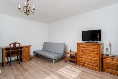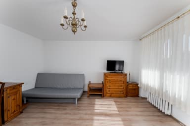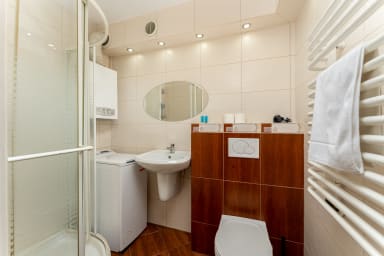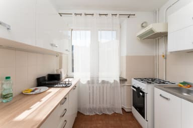 Bocheńska Standard Apartment consists of a living room with a sofa bed, a kitchen, and a bathroom. The apartment is equipped with Wi-Fi, terrestrial TV, a washing machine, an iron, a hairdryer, a fridge with freezer, a gas stove, a toaster, a kettle, and kitchen accessories. Guests can use the public parking outside the building, which may involve an additional fee.