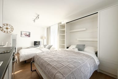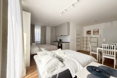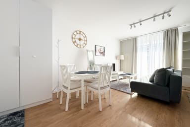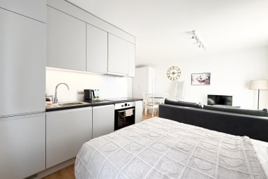 Mieszczańska Charming Studio is a stylish and practically furnished apartment featuring a living room with a sofa bed and a comfortable double bed, a kitchenette, a bathroom, and a terrace where guests can relax and enjoy a morning coffee. Guests have access to a range of practical amenities including free WiFi, a TV, a washer-dryer, an iron, a hairdryer, a dishwasher, an electric stove, an oven, a microwave, a kettle, and kitchen accessories. Guests also have access to a parking space in the underground garage.