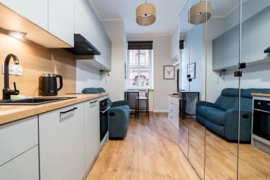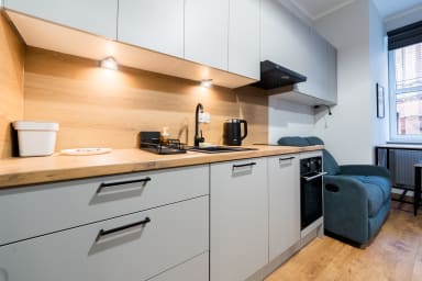 Park Wilsona Charming Studio features a living room with a seating area and a kitchenette, a separated sleeping area with a bunk bed, and a bathroom. It offers a range of high-quality amenities including free WiFi, satellite TV, a washing machine, hairdryer, iron, fridge with freezer, induction cooktop, dishwasher, oven, kettle, and kitchen accessories.