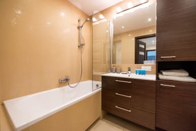 Mieszkanie posiada przestronny balkon, na którym goście mogą się zrelaksować z poranną kawą. Na miejscu dostępny jest garaż podziemny z prywatnym miejscem parkingowym.