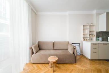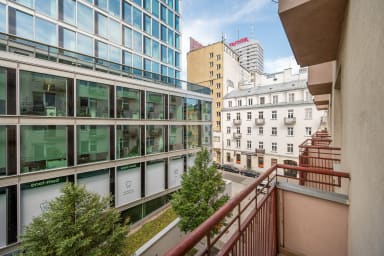 Widok Warsaw City Apartment to apartament położony w samym sercu Warszawy, tuż przy Nowym Świecie, jednej z najbardziej rozpoznawalnych i malowniczych ulic stolicy Polski.