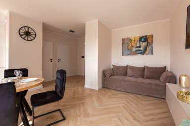 Apartament składa się z przytulnego salonu z rozkładaną kanapą, który płynnie łączy się z w pełni wyposażonym aneksem kuchennym, oddzielnej sypialni z komfortowym łóżkiem małżeńskim, eleganckiej łazienki oraz prywatnego balkonu – idealnego na poranną kawę, popołudniowy relaks czy wieczorną lampkę wina z widokiem na otoczenie.